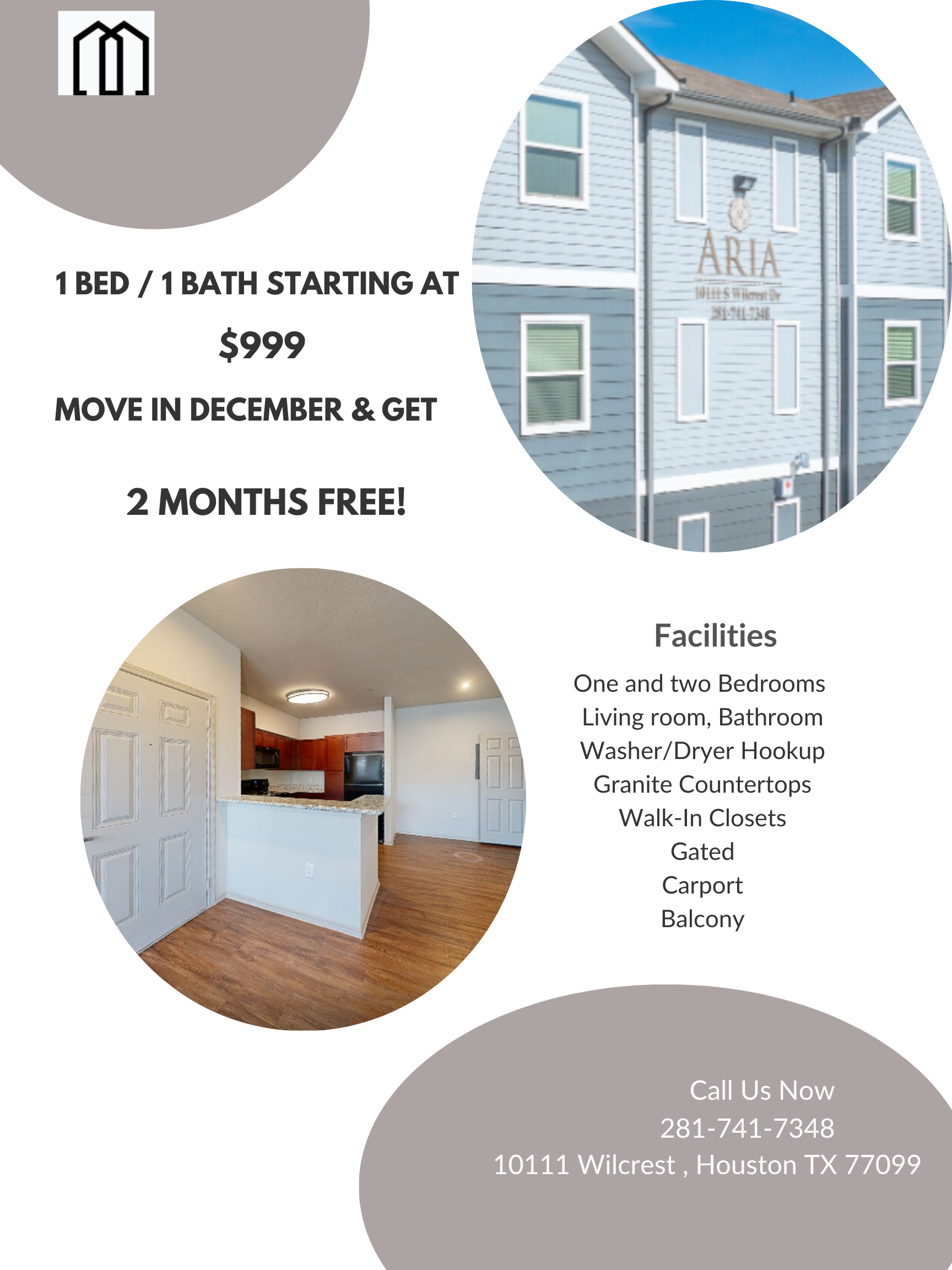 1 Bed / 1 Bath starting at $999 — Move in December & get 2 MONTHS FREE! Call today: 281-741-7348Specials